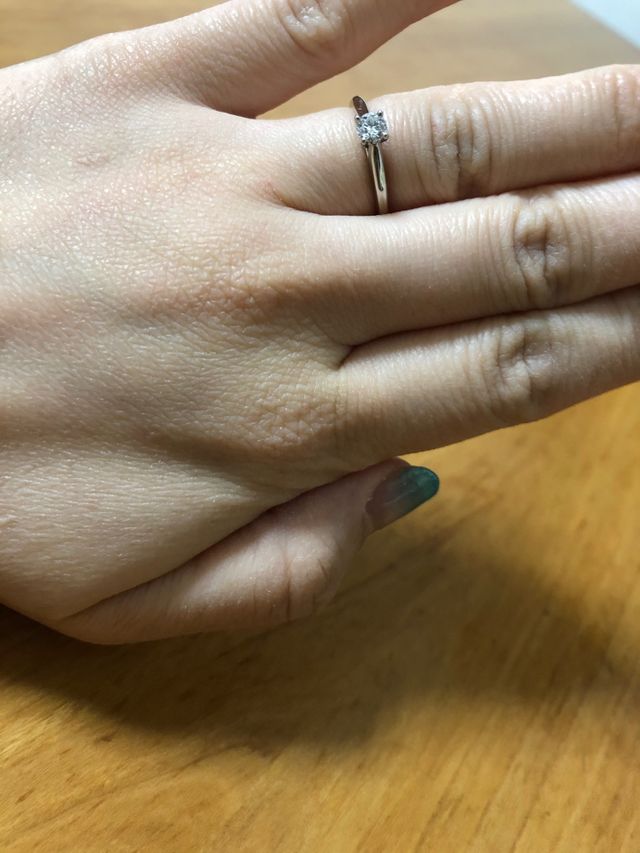 指輪のデザインは「ザ・婚約指輪」というものにしまいした。とてもダイヤモンドが美しく気に入ったのはもちろん、自分が一番憧れていた形だったからです。結婚指輪と合わせてもかわいくつけられるかなとも思いました。