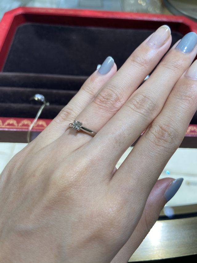 私自身カルティエかティファニーのどちらかで悩んでおりました。やはりどちらも定番ということでティファニーを試着してみましたが、しっくりくるのはカルティエでした。老舗ブランドの指輪にして良かったと思いました。
