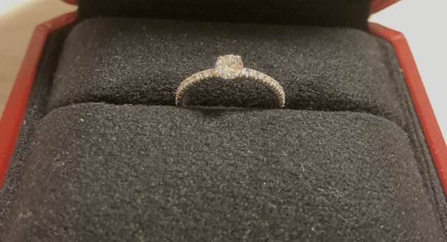 リングの部分にもダイヤがあり、キラキラとダイヤの光が指輪全体から感じられるデザインが購入の決め手です。またカルティエのブランドイメージぴったりの、洗練されたデザインにも惹かれました。婚約指輪として、妻にプレゼントしましたが、大喜びしていただけました。