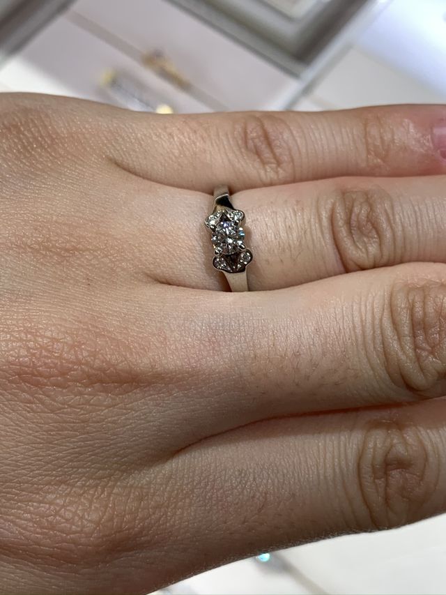 独身時代から、キラキラとしたリボンのようなデザインに憧れていて、結婚する時に選びたい指輪自己ベストに入っておりました。周りもこのデザインを選ぶ方が多い印象です。それだけ、こちらの指輪が人気が高いということだと思います、、