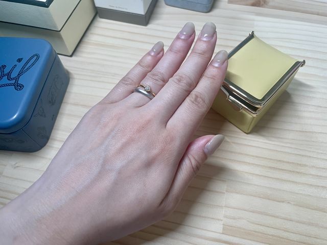 結婚指輪と重ね付けして高くなくていいから毎日つけられるデザインを要望しました。ダイヤが飛び出ていないのも私のイメージ通りでかわいいです。シンプルなデザインにもダイヤが輝やき、おしゃれリングのようにつけることができています。