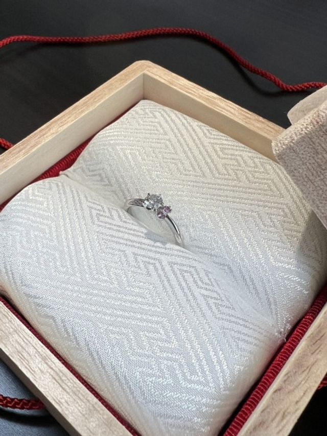 指輪のデザインは、和のデザインで、桜のようなデザインになっています。今回購入したものは、ダイヤモンドとピンクサファイアのオーダーにしましたが、ダイヤモンドの色とピンクサファイアの色合いがとても可愛いく、気に入っています。