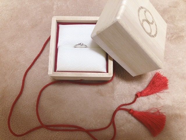 指輪のコンセプトもしっかりとしているところがいいなと思います。リングケースがシンプルな桐箱に赤い紐がついていてシンプルながらとても可愛いです。