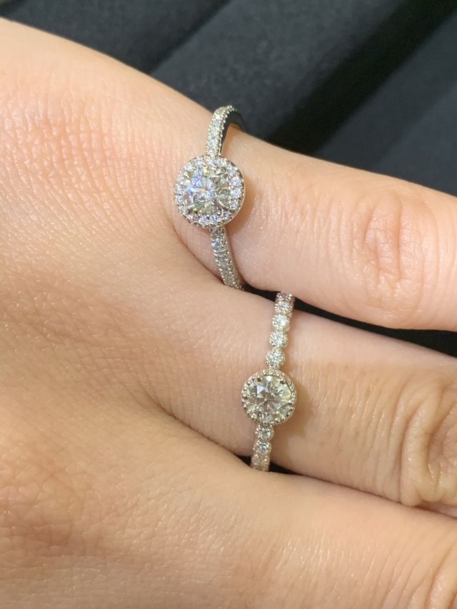 ダイヤモンドが豊富ですし、予算に合わせて選択しやすいです。重ね付けなどにもむいていますし、いかにも婚約指輪が苦手な方も着けやすいと思います。