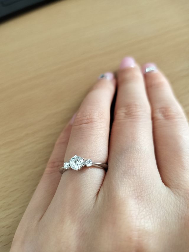 シンプルな1粒の立て爪ダイヤで探していましたが、高さがあるとダイヤが大きく綺麗に見える一方、使うシーンを選びそうだなと思い悩んでいました。ミキモトの立て爪は他ブランドより高さが低く、しかしダイヤがキラキラと輝いていてとても気に入りました。結婚指輪にも3粒ダイヤ付きを選んだため、婚約指輪もメレダイヤ付きにしましたが、重ね付けのバランスがよくとても気に入っています。
