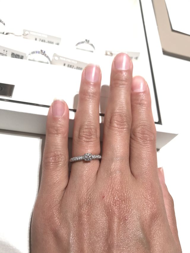 真ん中のダイヤは0.25ctくらいでした。4本爪で止まっているので小さめに見えますが、まわりの細かいメレがたくさん散りばめられていてとても綺麗でした。指輪の半分までメレなので、ゴージャスに見えます。これが欲しかったけれど、予算オーバーで断念!