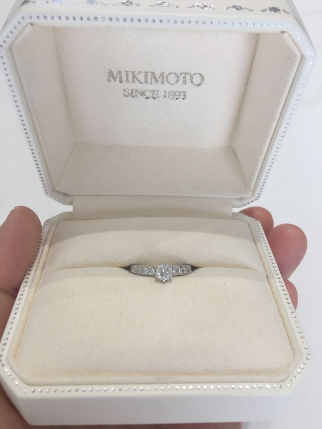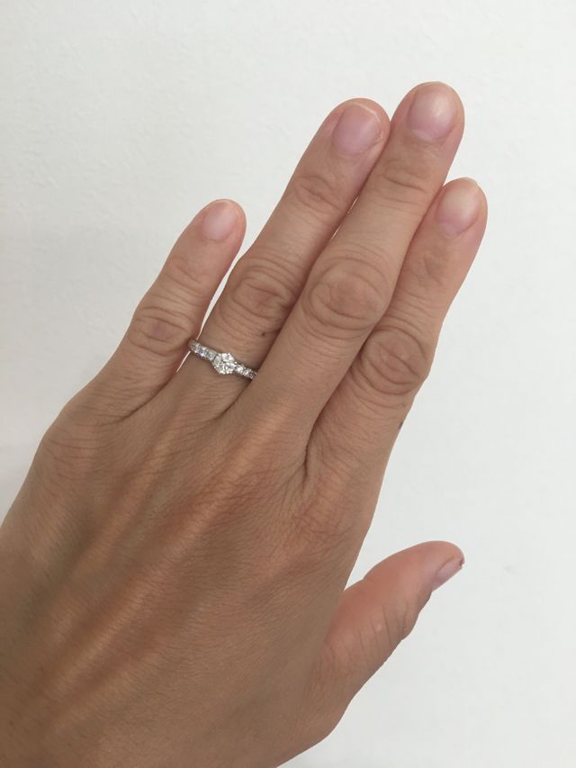 センターダイヤとメレダイヤが共にキラキラ輝き素敵だった。普段使いしやすいカラット数にしたが存在感がある。ザ・婚約指輪という感じの、定番のダイヤ1石の細い指輪と迷ったが、今は似合っていて可愛くても、歳をとった時に不似合いになりそうと思い、ボリュームのあるこの指輪にした。丸みがあり優しい雰囲気がある。着け心地の良さも素晴らしい。