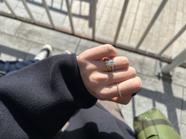 指輪のデザインは結婚指輪と重ねてつけてもぶつからないのがとても気に入りました。カジュアルにもフォーマルにも使えるデザインなので沢山つけたいと思います。