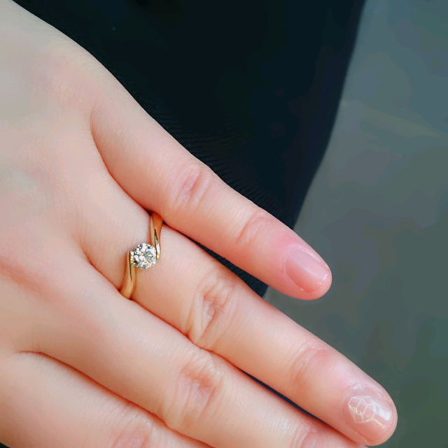せっかくの指輪を箪笥の肥やしにはしたくなかったので、気軽に普段使いできるように爪無し&高さが低い形にしました。地金はK18で、石が隅々まで見えるデザインが気に入っています。0.4カラットのダイヤは非常にキラキラ光りインパクトがあります。