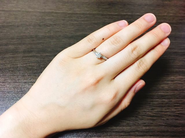 元々はストレートの一粒ダイヤを希望していました。ただ自分に似合うデザインを知りたくてお店の方にアドバイスを求めたところ、水かき部分が長いのでウェーブデザインの方が指が長く綺麗に見えるとのこと。
