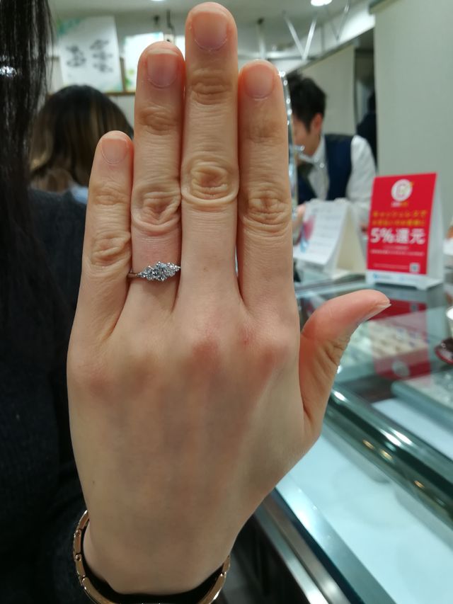 色々と相談させていただき、メインのダイヤの両サイドにメレダイヤが3つずつ付いて華やかな印象なものを選びました。