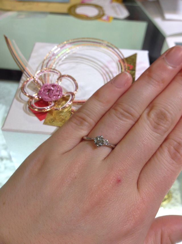 自分たちでダイヤを選ばせてくれました。予算やカラット数など大枠を決め、予算内でいけるダイヤを全て並べてくれました。その中からそれぞれがいいと思うものを選び、10個→5個→3個という風に、重なったものを残していきました。最後2個のうちどちらか…となったときに、お互いの意見が一致したので、即決しました*