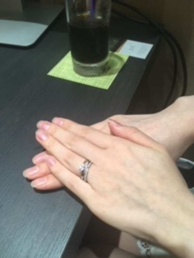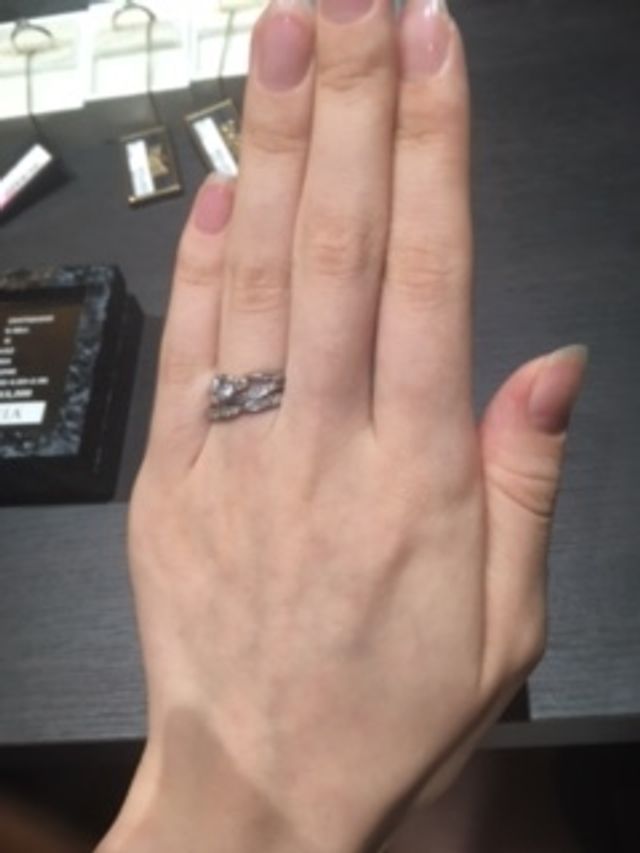 「お客様の雰囲気に一番合うと思いまして…」とお勧めされたデザインです。シンプルですが、ダイヤが綺麗に見える絶妙なバランス。重ね付けしても素敵なデザインに惹かれました。(調子に乗って3本付けまでさせていただきました。)