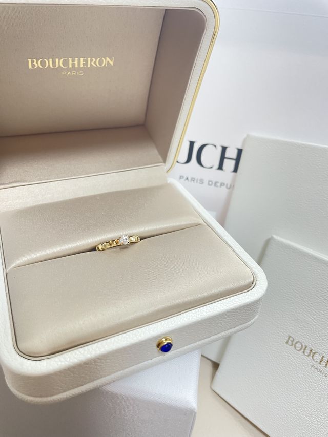 リングは肌馴染みのよいゴールドで、ダイアモンドの土台は4つの爪で凹凸が少なく美しい。婚約指輪をつけるタイミングを考えると、あまりなさそうに感じ、せっかくなら普段のちょっとしたオシャレとしてもつけたいと思うデザインなところに惹かれ、即決しました。