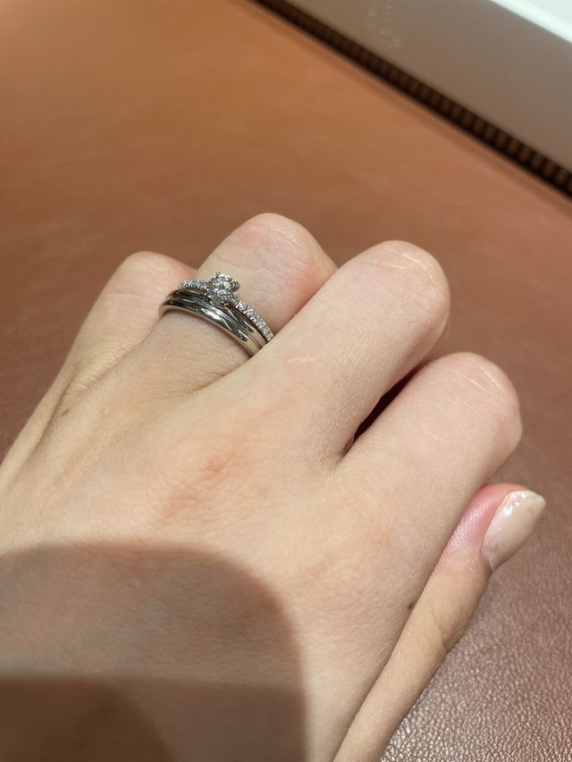 リングの幅が他店と比べて細く、自分の長くない指につけるとちょうどいい存在感であったことが魅力的でした。また、ぐるっと半周小さなダイヤモンドが埋め込まれているので、どこから見ても華やかに感じて素敵です。