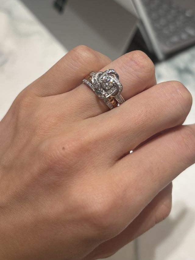 お花のデザインがとても可愛い指輪です。真ん中のダイヤの大きさを選ぶことができるようで、この写真のダイヤは0.5カラットでした。周りのダイヤもキラキラしていて可愛いですし、ボリューム感も出るので一生に一度にピッタリかなと思います。