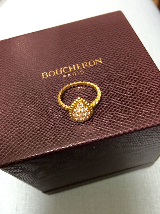 婚約指輪でゴールドのものが欲しかったので、ゴールドということがまずひとつ。それから、いわゆる婚約指輪!というデザインのものより、普段にも使えるデザインだったことが決め手でした。ダイヤが8つついていて、意味があるとか。両親には末広がりだねえと言われましたが^ ^