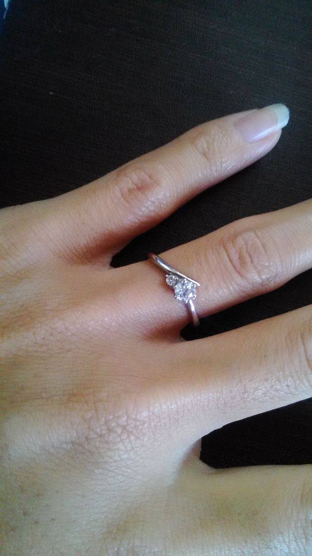 私は指が短くて少し太めなため、よくある定番のダイヤモンドひとつが付いたデザインは似合わないと思っていました。なので大きなダイヤモンドの横に小さいダイヤモンドが付いてリングもただの丸ではなく少しデザイン性のあるものの方が指が細く綺麗に見えるかと思い、こちらを選びました。