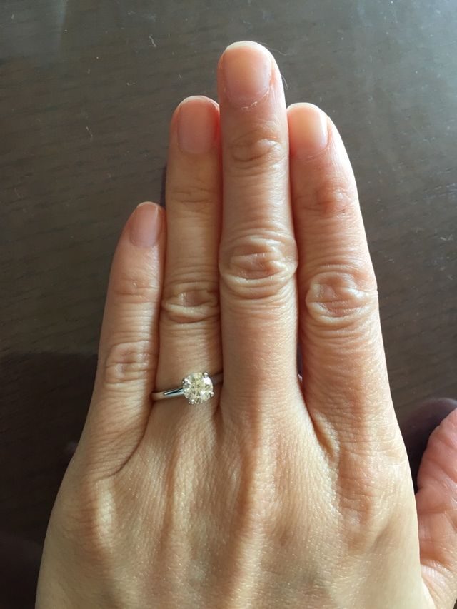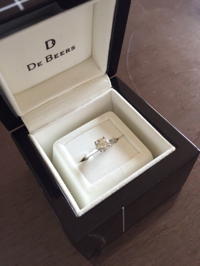 ダイアモンドの美しさを一番良く表す立て爪のデザインにしました。このデザインはダイアモンドに少しでも黄ばみがあると分かってしまうので、グレードの高い選ばれた石だけが使えるデザインです。デビアスの指輪は虹色に輝くので、とても綺麗です。