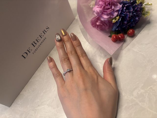 caratは大きすぎず、小さすぎず、自分の指に合っていてよかった。一つのダイヤだけではなく、周りにダイヤがついていて、他の人と被らないところも良と思っています。