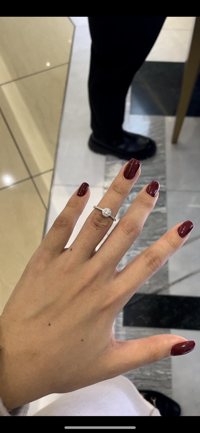 真ん中のダイヤが大きすぎず、でも、ちゃんと存在感があるところ。ここに女子の夢が詰まっている気がした。私の指が華奢ではないので、リングの太さが少し細めであるところも魅力的だった。あとダイヤが指輪のリングにも付いているのも良かった。