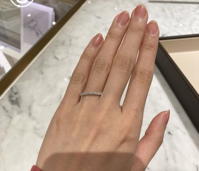 ダイアモンドのエタニティリングが欲しかったので見に行きました。スタッフさんに案内されたのは、こちらのハーフエタニティリングでした。華奢なデザインで少し細いのが気になりました。値段もそこまで高いと感じませんでした。