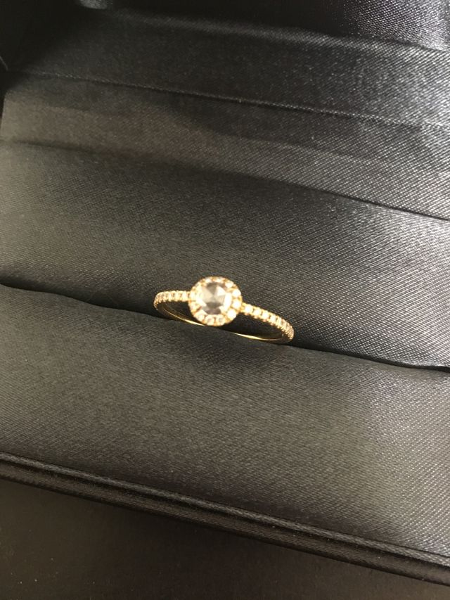 デザインが可愛すぎて一目惚れでこれに決めました。婚約指輪は付ける機会が少なくなるのが普通だと思うのですが、普段にも付けれるようなものが良いなと思っていました。ダイヤのカットがローズカットなので横に広く服などに引っかかる心配もなく、ギラギラしすぎないところも決め手です。結果今は普段にも付けれているので買って良かったです。