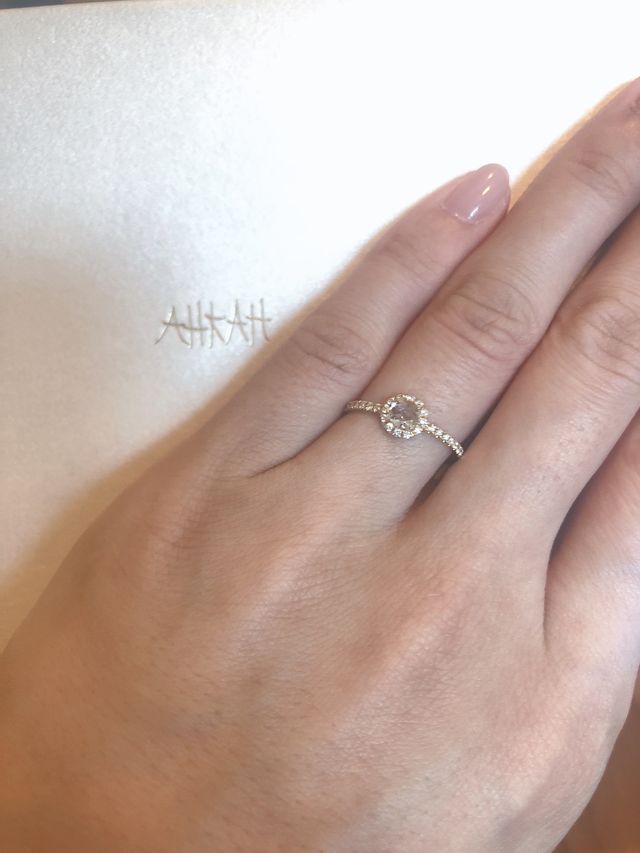 具体的なブランドやデザインで決めていたわけではなかったのですが、一目惚れして価格を見ずに決めてしまいました。キラキラした石と華奢なデザイン、カラーが他にはない繊細な指輪だったので決めました。また、彼の気に入ったならそれにしなよ。という言葉で決めました。