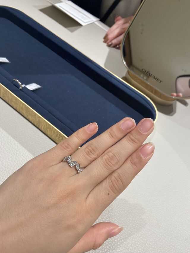 いわゆる婚約指輪の形ではなく、普段使いしやすいデザインに惹かれて購入しました。縦爪だと普段高い出来ないけれど、一般的なエタニティタイプだと他のブランドにもあって個性が出せないと思っていたので、普段高い&個性を出したい方におすすめです。