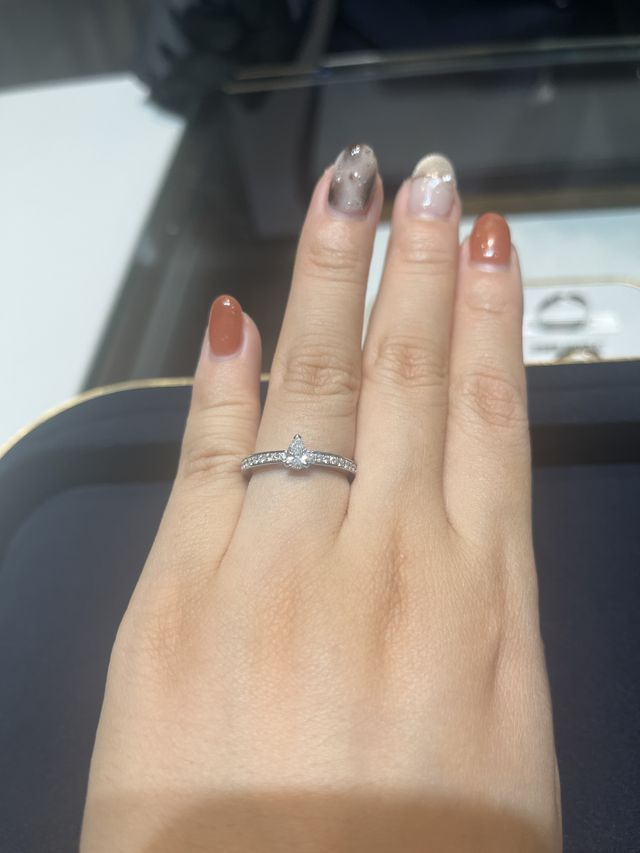ショーメに憧れがありジョゼフィーヌ(しずく型のダイヤが中央にあり、フルで小さなダイヤが敷き詰められているタイプ)を試着しました。とても可愛かったのですが、短く太めの指にはあまり合わないように感じました。