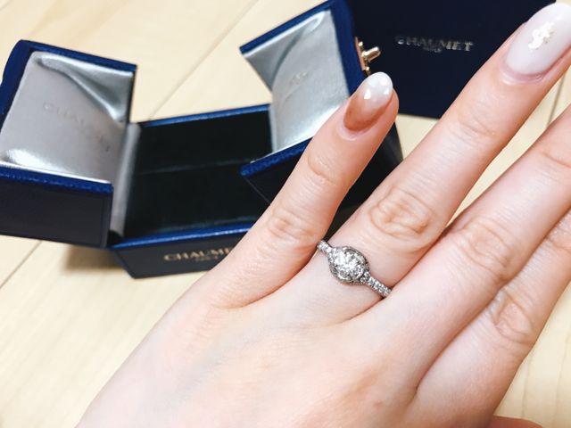 大きいダイヤモンドが付いたデザインは最近少ないようですが、幼い頃に描いたエンゲージリングの夢を叶えてもらえたような気がします。