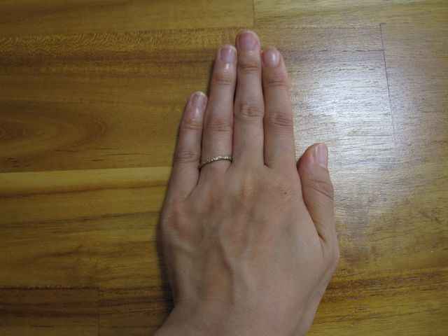 光沢がありすぎない色味と可愛らしいデザインが購入の決め手です。もともとシンプルなアクセサリーが好みなので細いラインのものを選びました。ほかの指輪と合わせやすいですよとお店の方のアドバイスして頂き、記念日に買い足していけるのも良いと思いました。