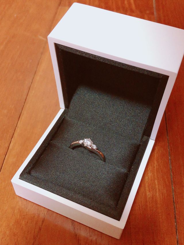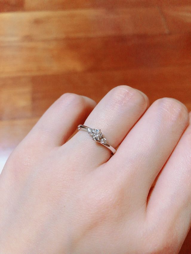 このリングは一目惚れしたものです。ショーケースの中に並んでいるものの中で一番キラキラ輝いて見えました。実際な試着させていただくとリングデザインのS字カーブのおかげで指が長く見え、より好きになりました。
