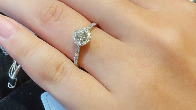 ハーフエタニティにセンターは約0.2カラットのダイヤモンドを取り囲むように小さなメレが取り付けられていてとても華やかな印象のリングでした。台座が少し高くなっているので結婚指輪と合わせてつけても馴染むところもよかったです。