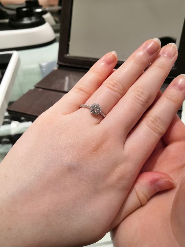 もともとヘイロータイプを探していました。正面からみたときにプラチナの囲みがみえないこと、また横から見たときにシルエットがきれいなことが理想でしたが、その通りのデザインでした。また、リング本体部分も細目で、華奢かつダイヤが大きく見えます。