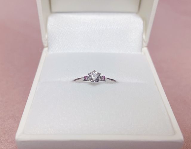 サイドストーンをピンクサファイアピンクにしたのですが、色の濃さが選べて、店員さんのおすすめでデフォルトより1段階濃いものにしました。(大正解でした!