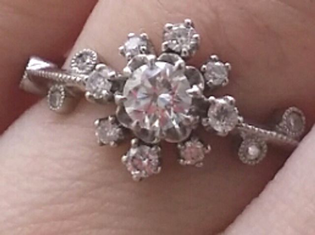 センターの太陽のような、お花のような大きなダイアモンドと、とても繊細なミル打ちがポイントのリングです。