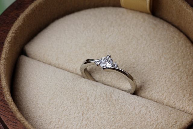 セットリングになっているので、結婚指輪と合わせると統一感があるのでとても良いです。少し捻ったようなデザインにメインのダイヤと2つのメレダイヤが付いていて少し珍しい形だと思います。