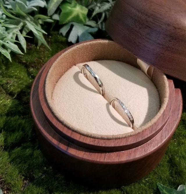 植物をモチーフにしたデザインは柔らかい印象を受けました。また指輪一つ一つに花言葉が込められており、指輪選びに悩まれてる方は、二人にピッタリな花言葉から指輪を探すなんてこともしてみてはと思います。保管用の箱もおしゃれでした。