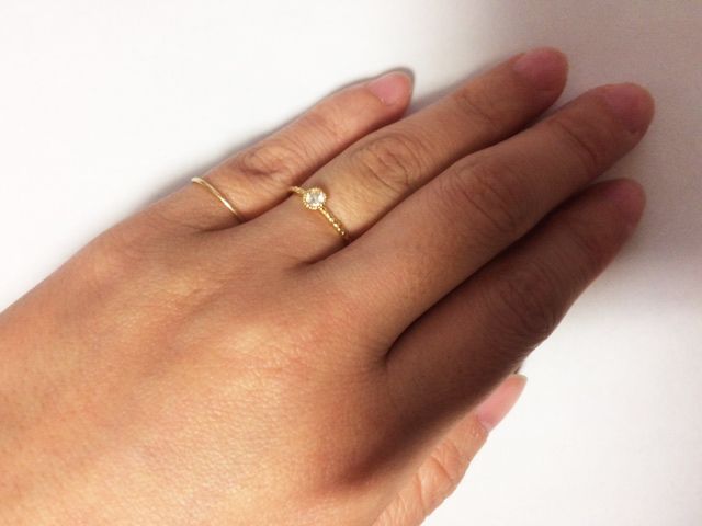 ずっと好きなブランドだったので、絶対ここで!と決めていました。いわゆるブライダルのものは大ぶりで好きではなく、普段使いで、華奢でさりげないタイプのものにしました。はじめは石もついていないただの金のリングが良かったのですが、彼が石付きのものにして欲しそうだったのと、実際つけてみると華やかさに欠けるので、悩みました。結局店員さんとも相談しながら、石付きの、細くて華奢なリングにしました。石もある程度の大きさがあり、華やかさもあって大満足でした。