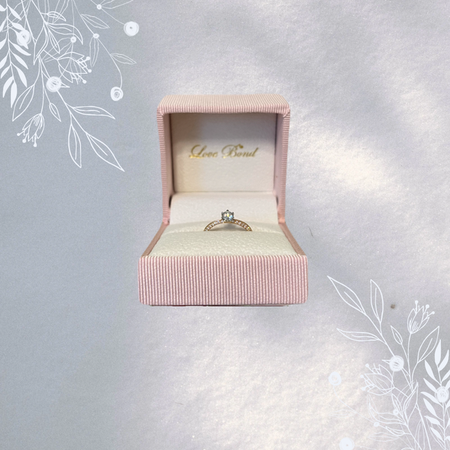 メインのダイヤの周りに細かいダイヤがついていて、キラキラして綺麗。ピンクゴールドとプラチナが素材として使われているため、素材としても強度があると説明があったので、これからも長く使えると思う。ダイヤの囲んでいる素材がプラチナのためダイヤの透明感が際立って美しい。