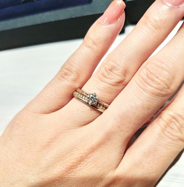最初は有名ブランドのものが欲しかったのですが、このお店でとても気に入ったデザインのものを見つけて一目惚れし、こちらに決めました。ベースがプラチナにゴールドのライン入り、真ん中を半分にしてシンプルな面とダイヤがずらっと入った面の両方が楽しめるとてもお気に入りのデザインにしました。