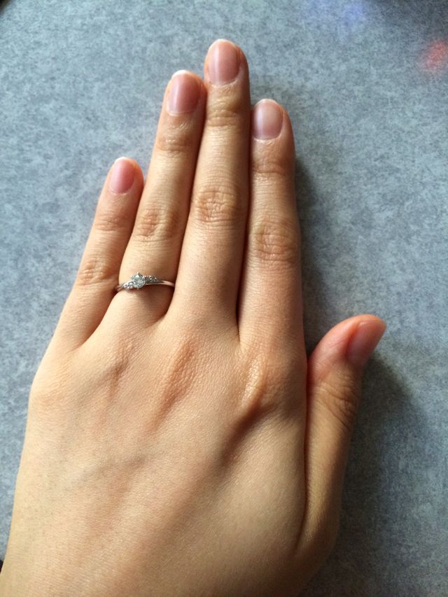 メレタイプの形状ですので、指になじみやすく細く見えるという部分と中央のダイヤの両サイドに小さ目のダイヤのデザインと言う部分が気に入りました。