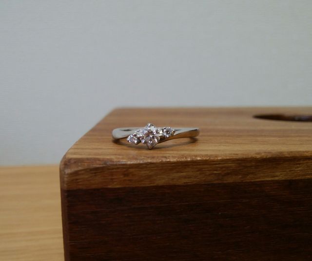 指輪のデザインは中央のダイヤモンドの両サイドに小さいダイヤモンドがついているものです。