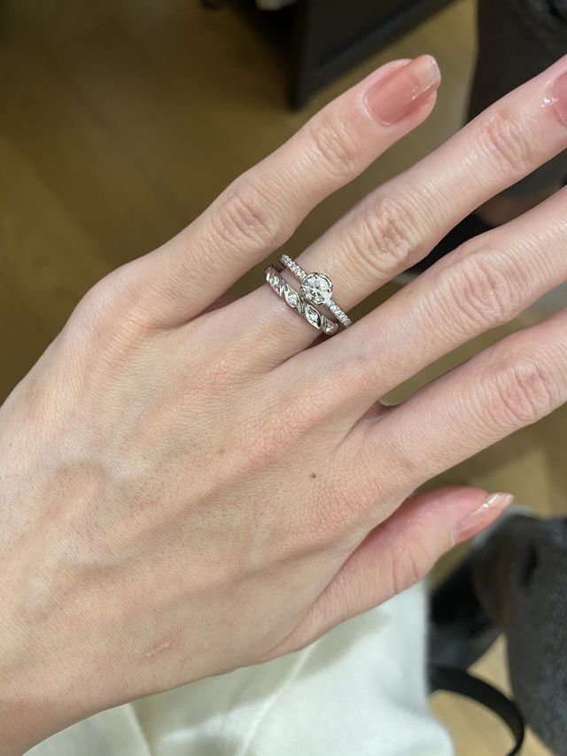 The婚約指輪みたいなデザインが好きではなく、普段使いできるけど遊び心もあるというような指輪を探していたので、デザイン的にとても好きでした。真ん中のダイヤがお花みたいになっていて、割とどんなデザインの結婚指輪とも合うのかなと思いました。