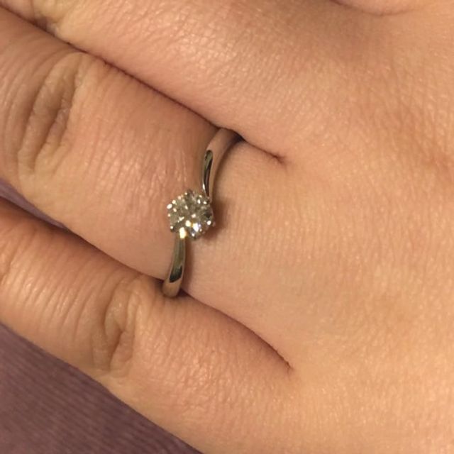 リング幅の狭い感じのものを探していましたが、実際に試着すると若干広めのもののほうが自分の指には合っていると感じたこと、そしてシンプルでありながらセンターのダイヤモンドが大きく見えるデザインで存在感があることが決め手になりました。