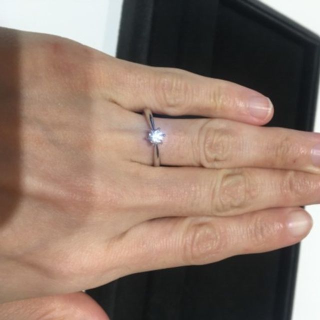 王道のソリティアデザインでありセンターの大きなダイヤモンドに向けて絞るようになっており、ダイヤモンドの輝きをしっかりと感じられます。もともとシンプルなデザインを探しており、ダイヤの大きさと予算の兼ね合いでこのデザインに決まりました。