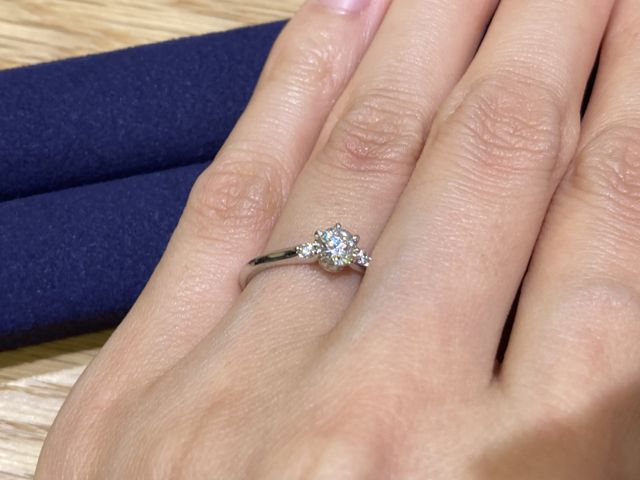 Foulasonという花モチーフの指輪にしました。色々ある中私はパンジーにしました!プロポーズリングということであとで指輪を選ぶのですが色々あってかなり悩みました。シンプルかつ可愛いものを選べたのでよかったです。