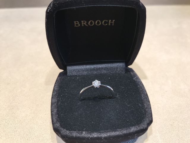 ブローチさんのオリジナルデザインとのことで、シンプルな分、年齢が経っても違和感なく身につけていられそうです。相手方からいただいたダイヤモンドが小さい分、飾りが少ないものが似合うという点もポイントでした。