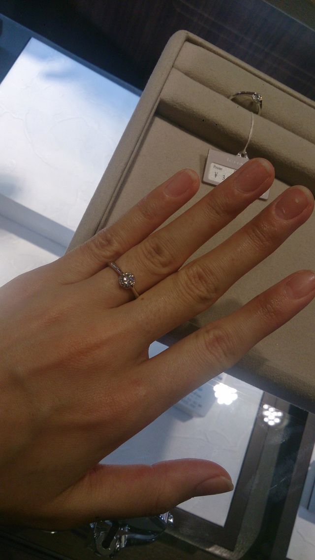 こちらのデザインは、石座がとても凝っているため、ダイヤモンドが強調されてとてもきれいでした。試着させていただいたダイヤモンドの大きさは0.3カラットとそれほど大きくないのですが、石座が工夫されているために0.4カラットよりも大きく見え迫力がありました。